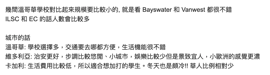 後續我透過 LINE 再詢問一些細節時,顧問的回答也比較簡略,像是我問「A、B學校分別有什麼優缺點或評價」,顧問只有回說「A的華人比例比B多」就沒有其他的回饋了,後續我再問有沒有其他學校推薦時,顧問也還是以原本推薦過的學校為主。