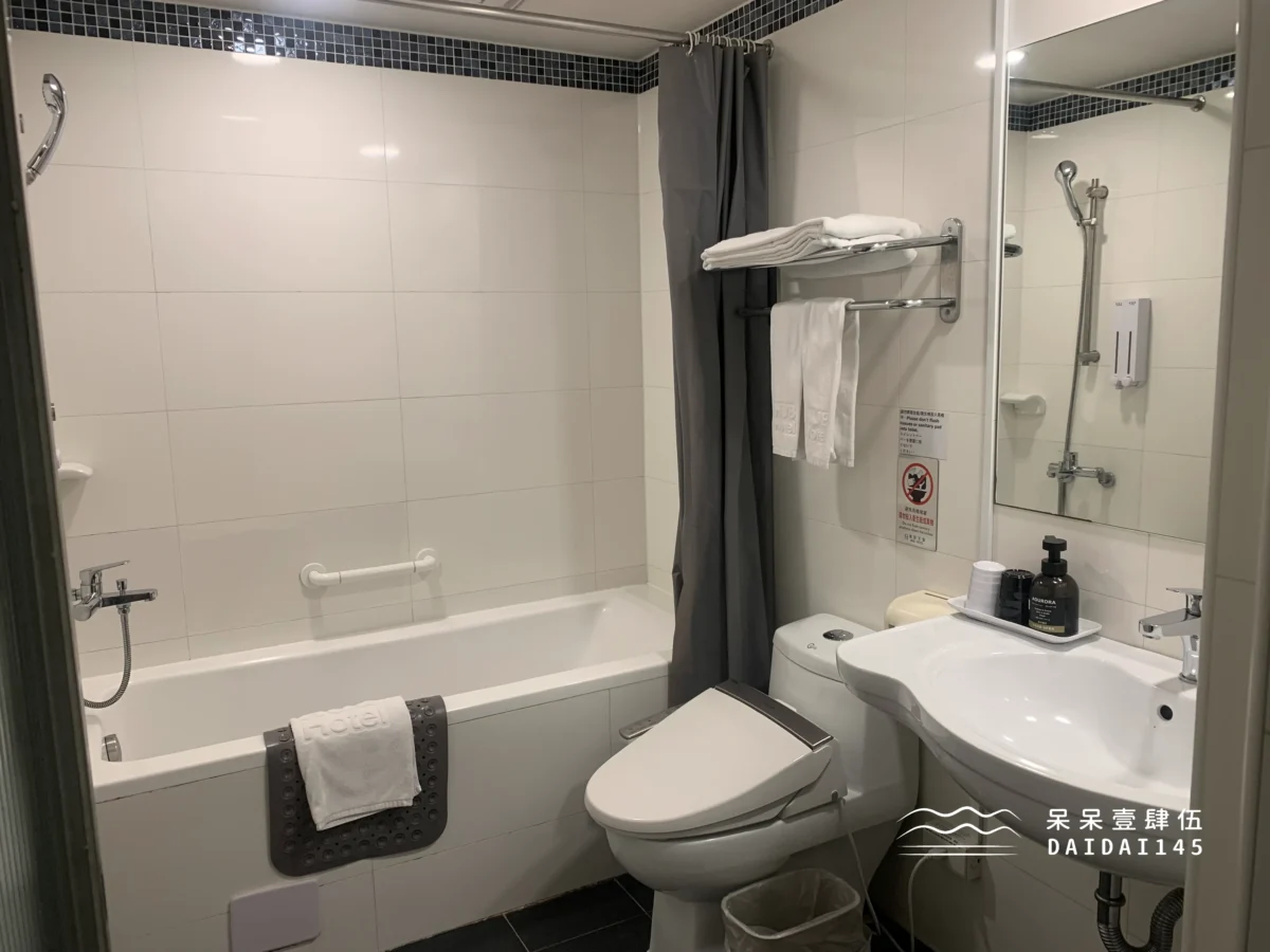 再來就是重頭戲「浴室」了!浴室坪數大概佔了整個房間將近一半,空間非常之大,除了有我們最愛的浴缸外,還有冬天必備的免治馬桶,唯一的小缺點就是沒有乾濕分離,洗澡時記得要把拉簾拉起來、放進浴缸裡,不然水會直接流出去外面的地板哦!
