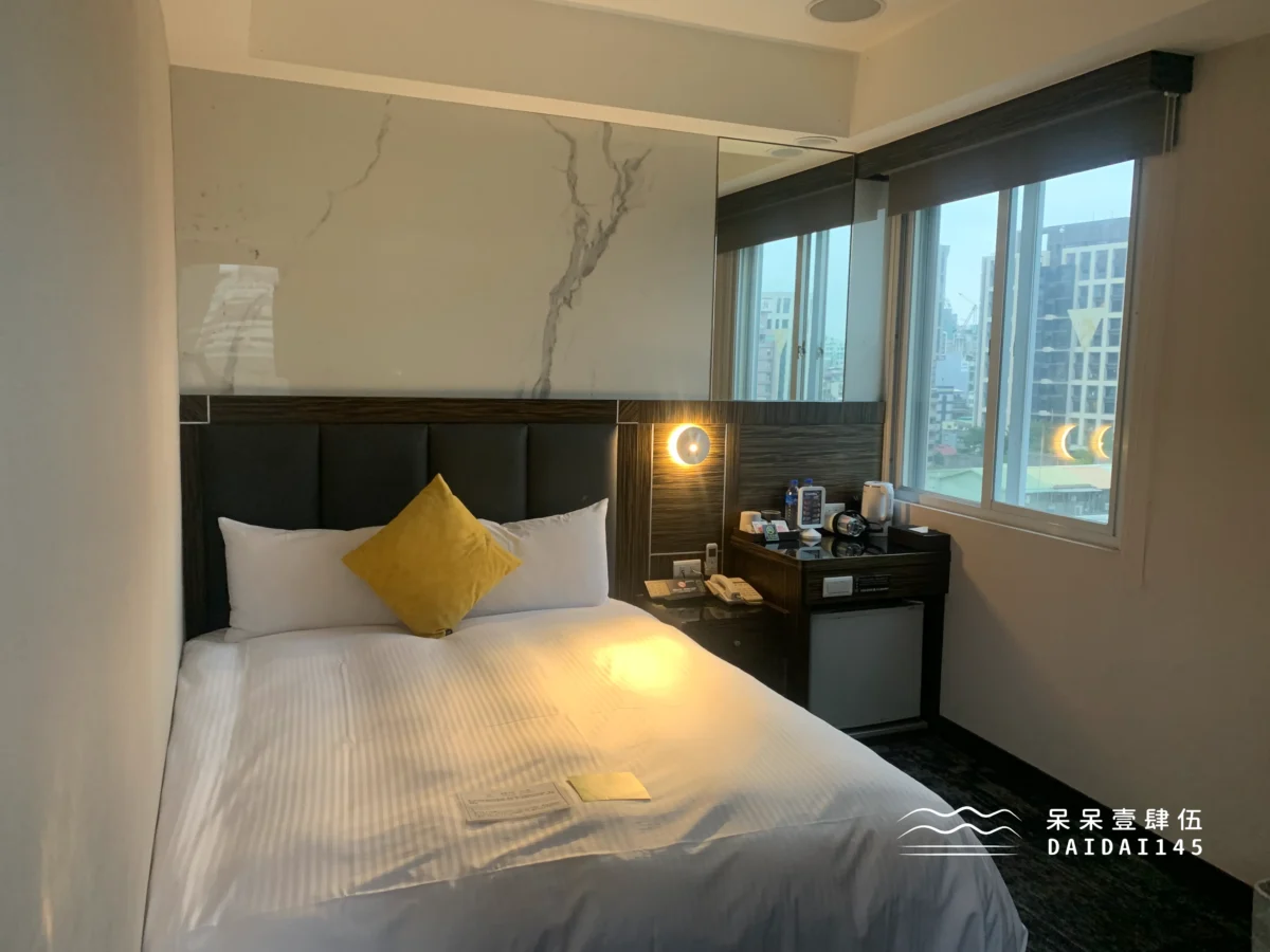 市景客房空間約 4.5 坪,包含雙人床、床頭櫃、電冰箱、書桌、衣櫃,房間雖然不大,但是該有的東西都有,而且還有 2 面窗戶,白天只要把窗簾拉開,室內採光就非常好!