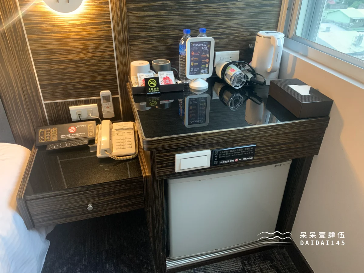 床頭附有兩瓶礦泉水、茶包及小零食,如果覺得不夠吃,可以再到 2 樓的 24 小時點心吧拿。冰箱上方設有一個節能開關,使用前記得先打開。