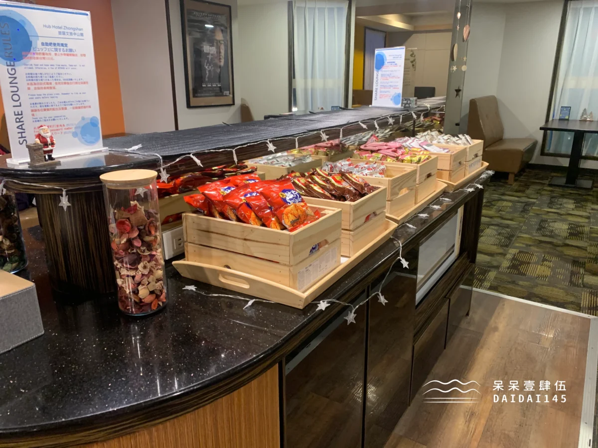 除了零食、茶水可以吃到飽外,吧檯旁邊還有一個 Hub Library(當時沒拍到照,所以借用一下官方粉絲團的照片),上面放有數十本旅居文旅中山館小編推薦的書籍,主題多樣且適合各年齡層,還有小朋友適合的童書區,如果在房間待到無聊了,不妨下來交誼廳翻翻書、吃吃零食!